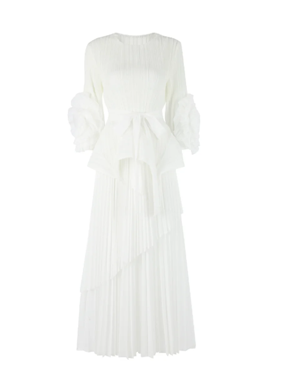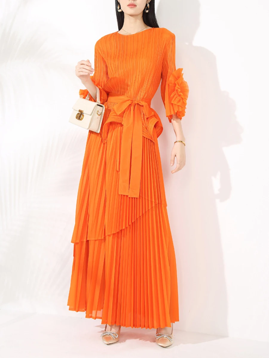 VGH Slimming Solid Temperament Draped Two Piece Set For Women Round Neck Long Sleeve Tops High Waist Dress Chic Sets Female New